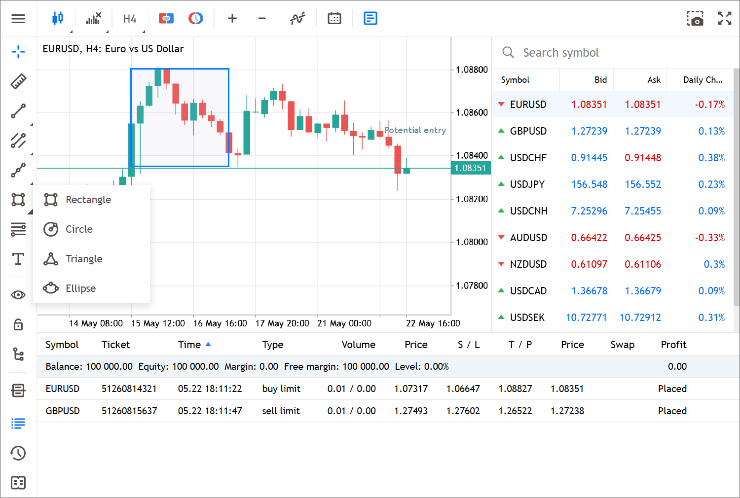 扩展可用分析对象的列表。现在,您可以利用标尺来测量时间和价格,绘制图形(矩形、椭圆形、三角形和圆形),并向图表添加标签。所有对象都可以在左侧面板中找到: